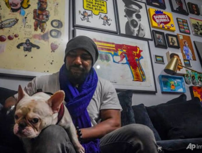 Painter Guy Stanley Philoche, a 43-yr-old Haitian immigrant and star in the New York art world, sit amid some of his latest work during an interview at his Eastward Harlem studio, Th Nov. 19, 2020, in New York. (AP Photograph/Bebeto Matthews)